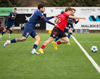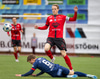 Hindrar mann þegar Smit ætlar að sparka frá marki.