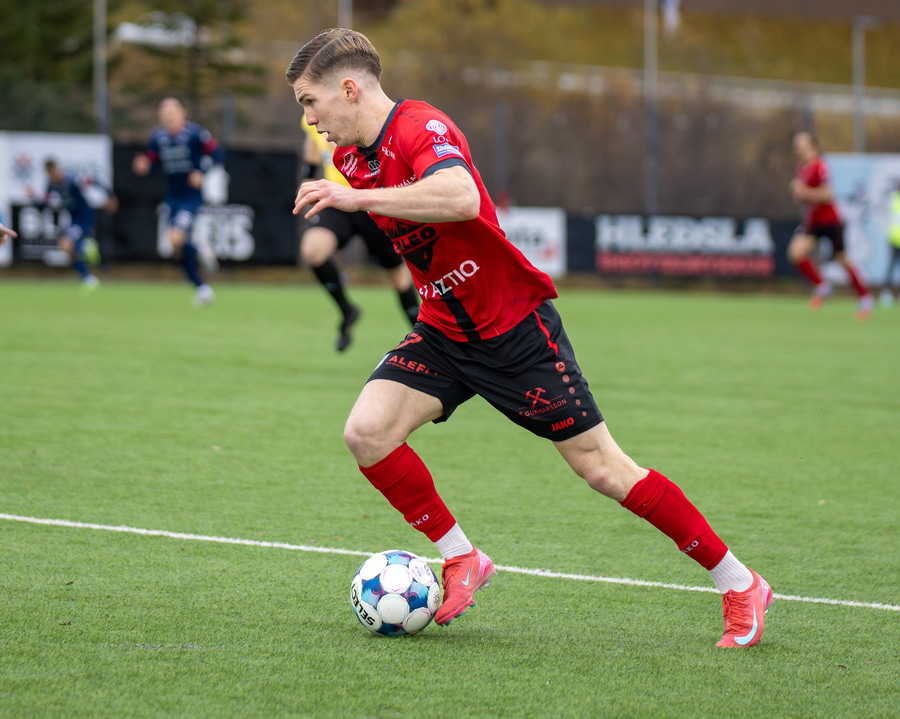 Hrannar með langt innkast sem fer á Aron Elí á nær. Hann nær poti í boltann en framhjá.
