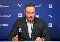 Valur Páll fer yfir málin i stúkunni í Baku