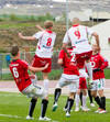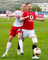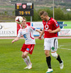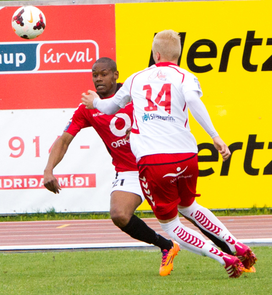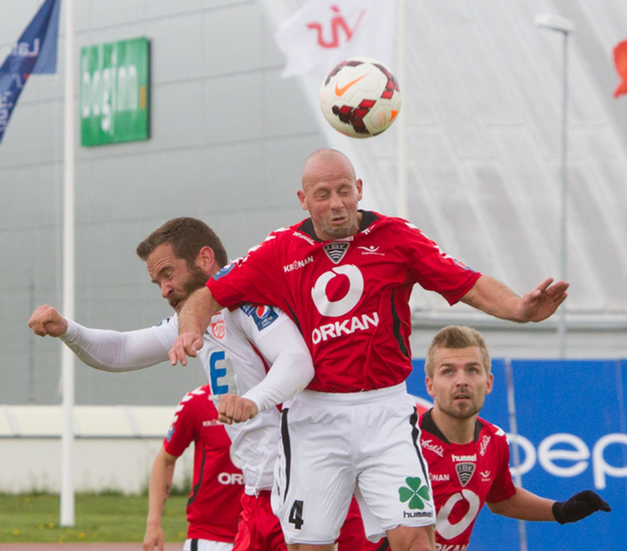 Shawn Nicklaw virðist geta allt. Hann á hér langt innkast inn á markteig sem skapar smá hættu. Jóhann Helgi vildi vítaspyrnu en fékk ekki.