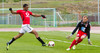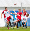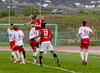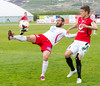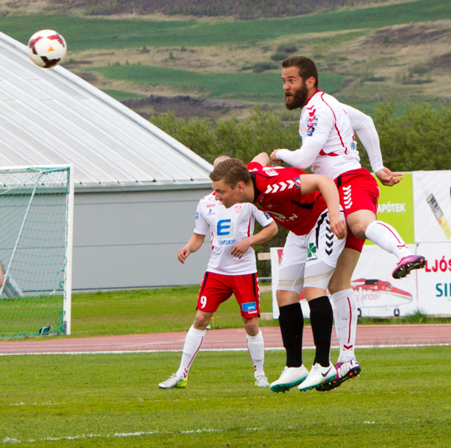 Hlynur Atli með frábæra aukaspyrnu frá miðlínu, beint á hausinn á Jóhanni Helga sem átti lausan skalla á Abel.