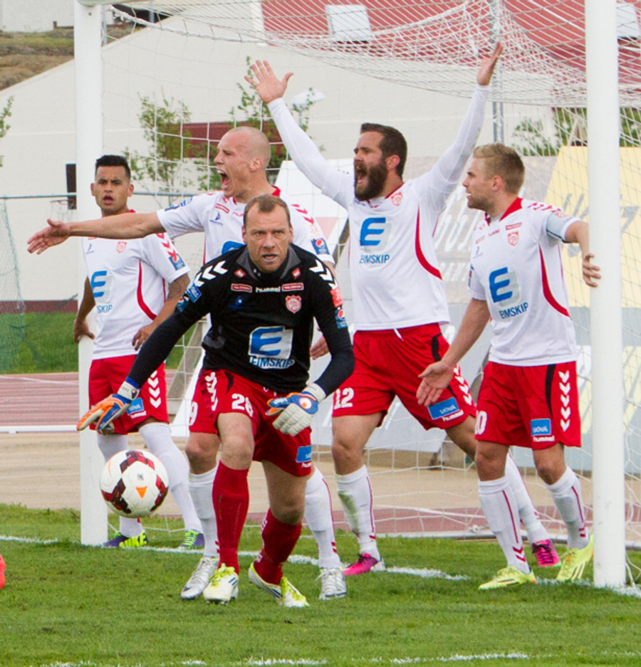 Sandor fór í úthlaup en missti af boltanum, náði þó að bjarga sér með markvörslu eftir skot frá Gunnari Þorsteinssyni.