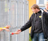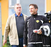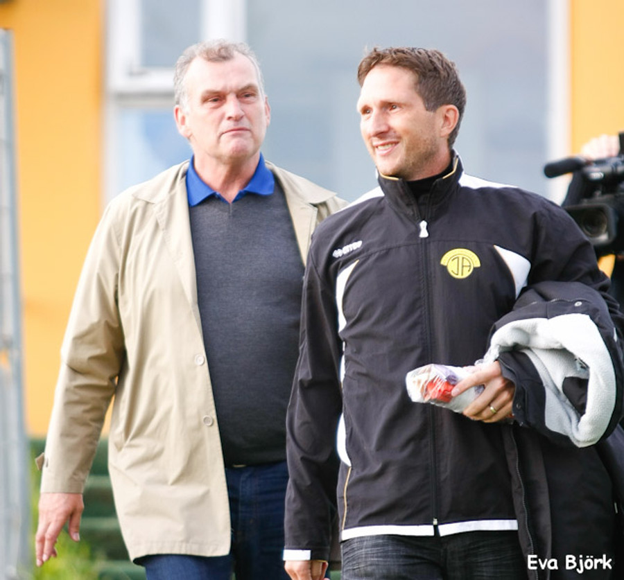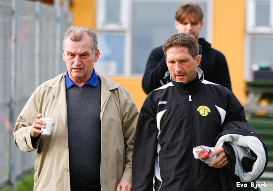 Guðjón Þórðarson er undir stöðugri smásjá allan leikinn hérna á Akranesvelli því honum fylgir myndatökumaður sem stendur við varamannaskýlið og tekur upp allar hans hreyfingar. Já... hann er vinsæll og veit af því!