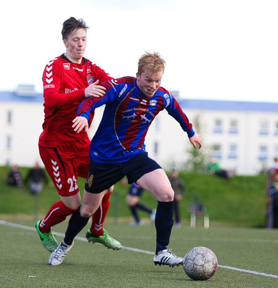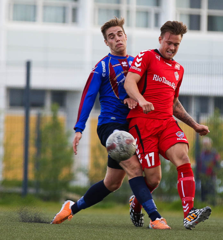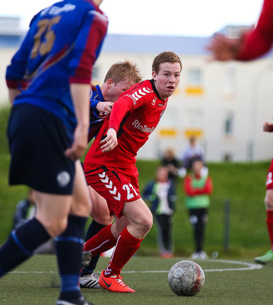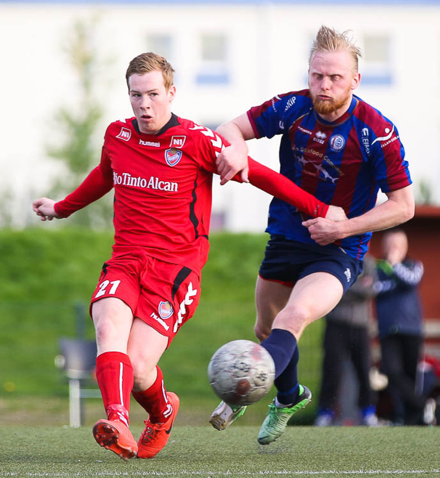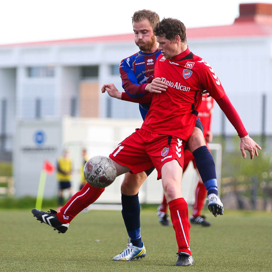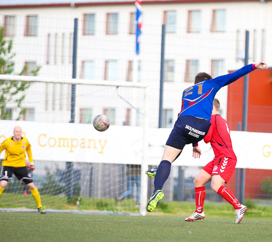 HÖRKUFÆRI! Leiknismenn voru að fá hörkufæri. Gestur Ingi með fyrirgjöf og Sævar Freyr skallaði en yfir markið.