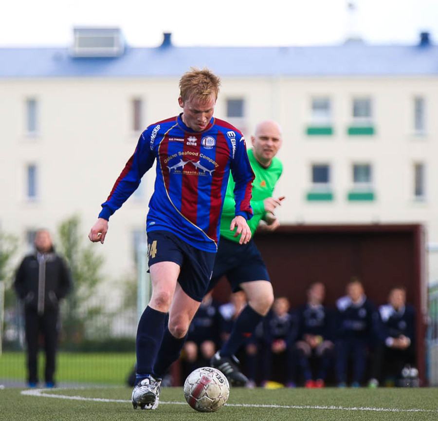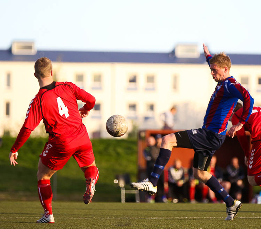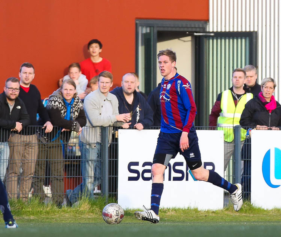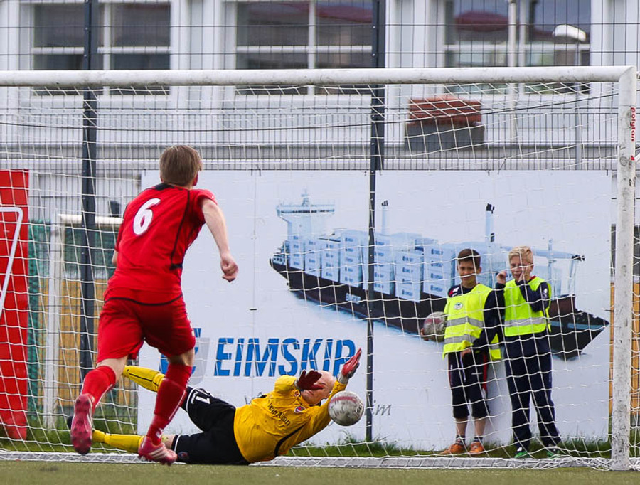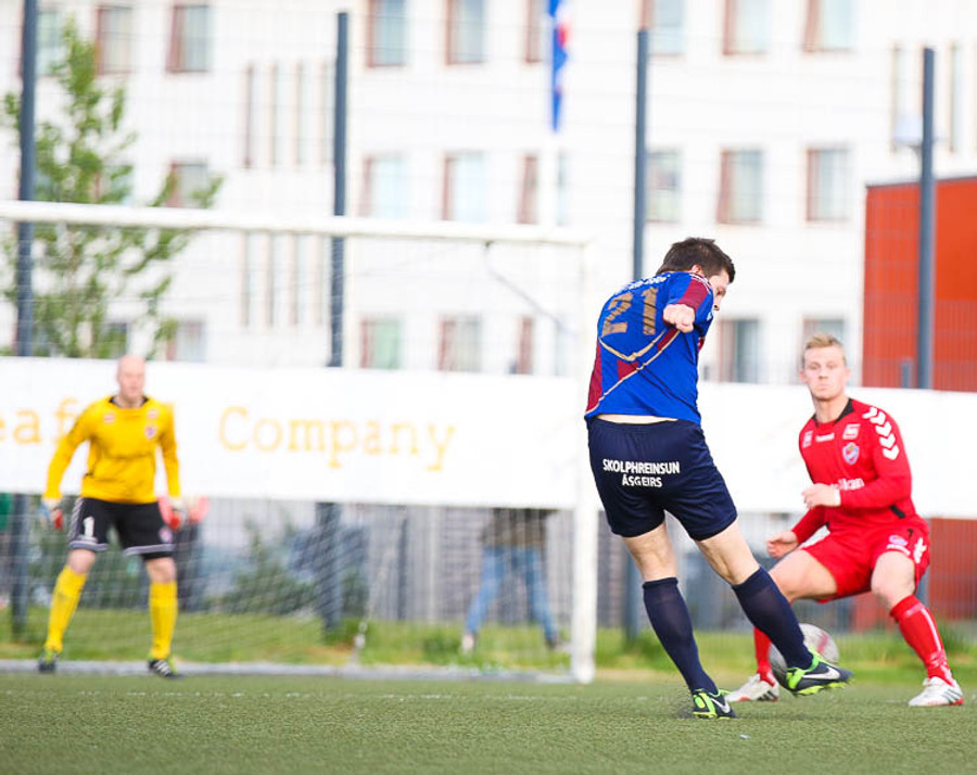 SLÁIN! Vigfús Arnar með skot úr aukaspyrnu sem fór í ofanverða slánna. Leiknismenn nálægt því að brjóta ísinn fræga.