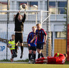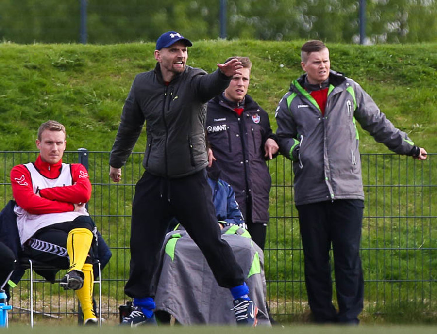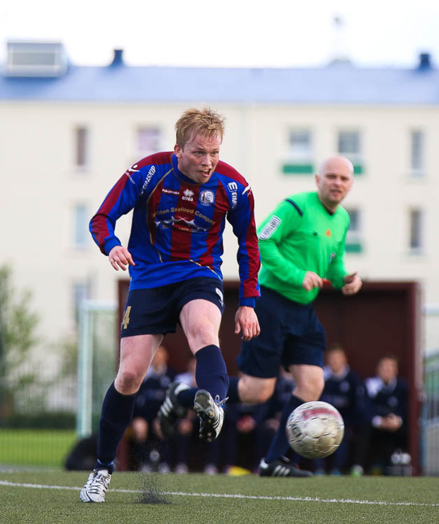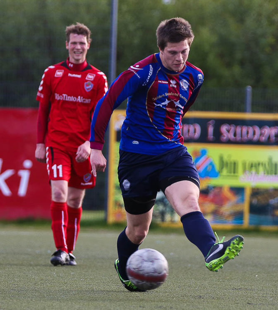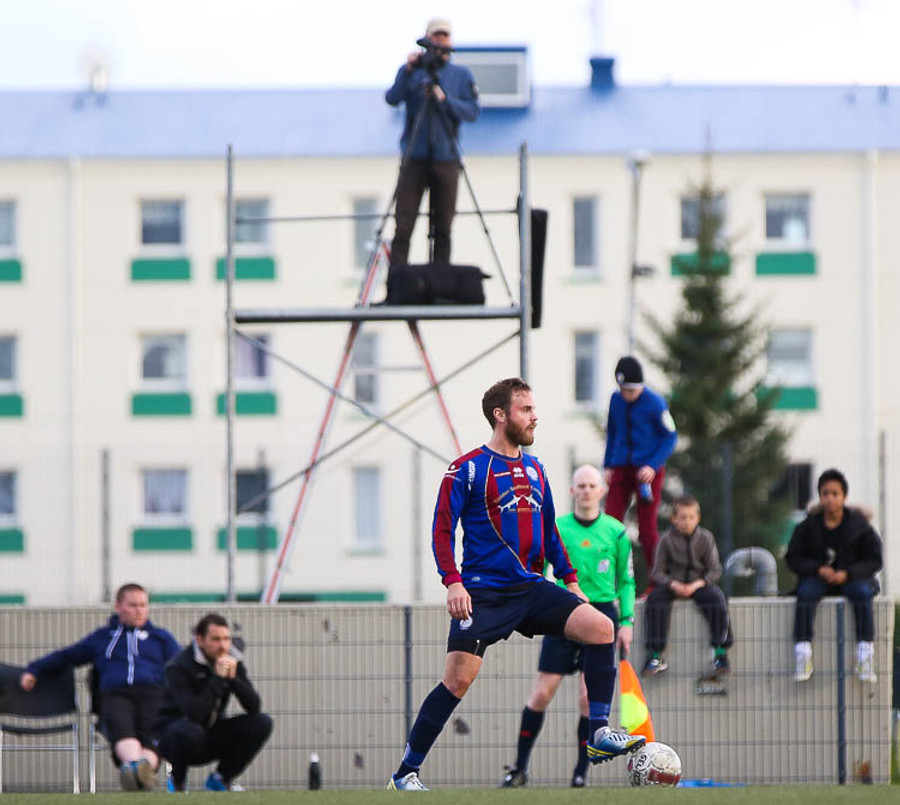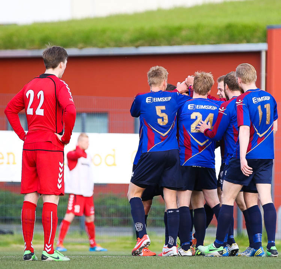 SLÁIN! Vigfús Arnar með skot úr aukaspyrnu sem fór í ofanverða slánna. Leiknismenn nálægt því að brjóta ísinn fræga.