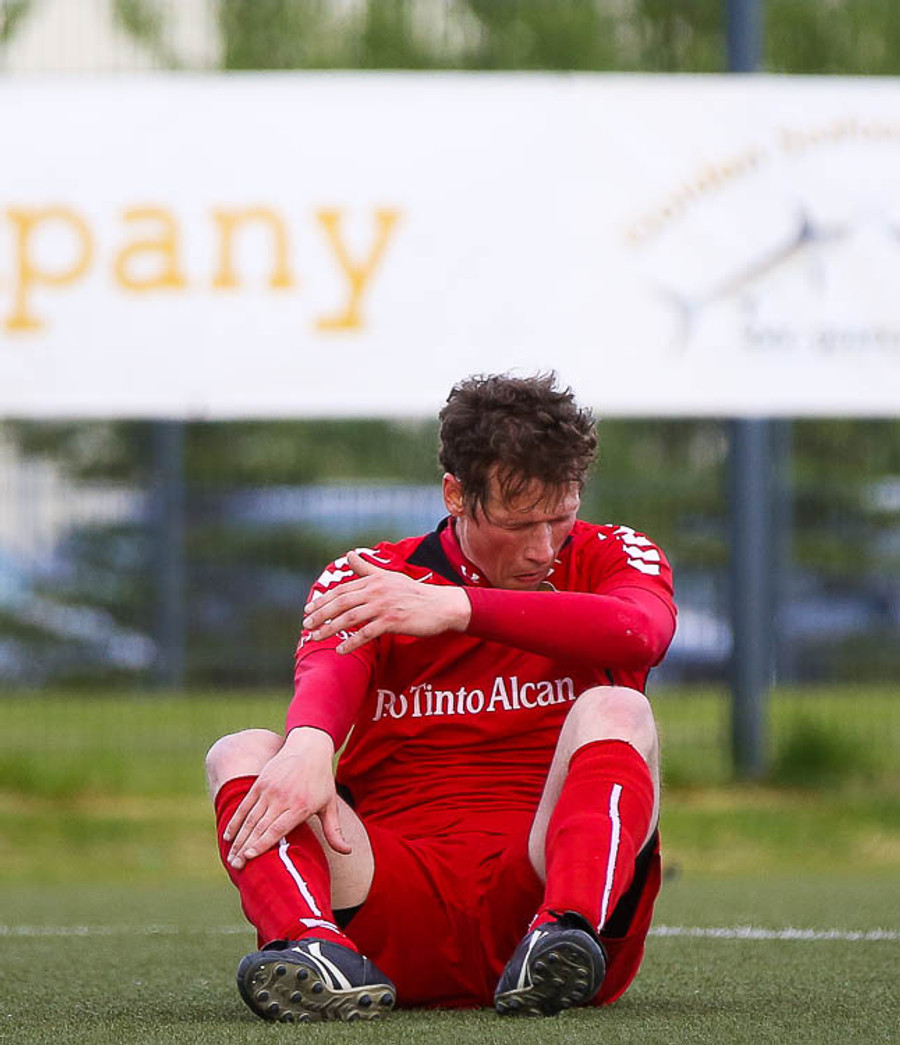 Hilmar fyrirliði fer meiddur af velli.