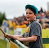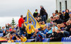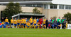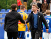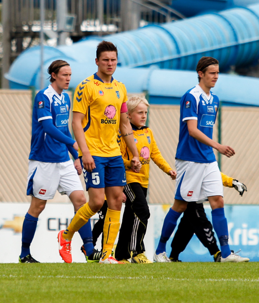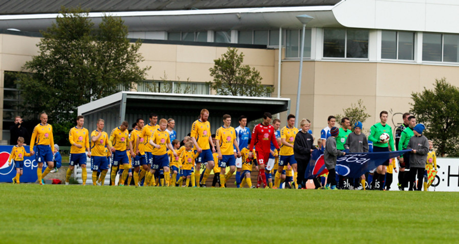 Liðin gangar hér inn á völlinn í halarófu á eftir dómurum og fyrirliðum að venju. Fyrirliðar í dag eru Bergsveinn Ólafsson í liði heimamanna og Ögmundur Kristinsson í liði Fram.