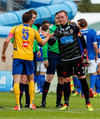 Aron og Halldór báðir staðnir upp og koma inn á völlinn von bráðar. Fjölnismenn heimta að þetta hafi verið aukaspyrna þegar Halldór fór í Aron en Vilhjálmur metur það svo að Framarar eigi að sparka boltanum til heimamanna.