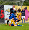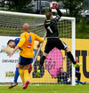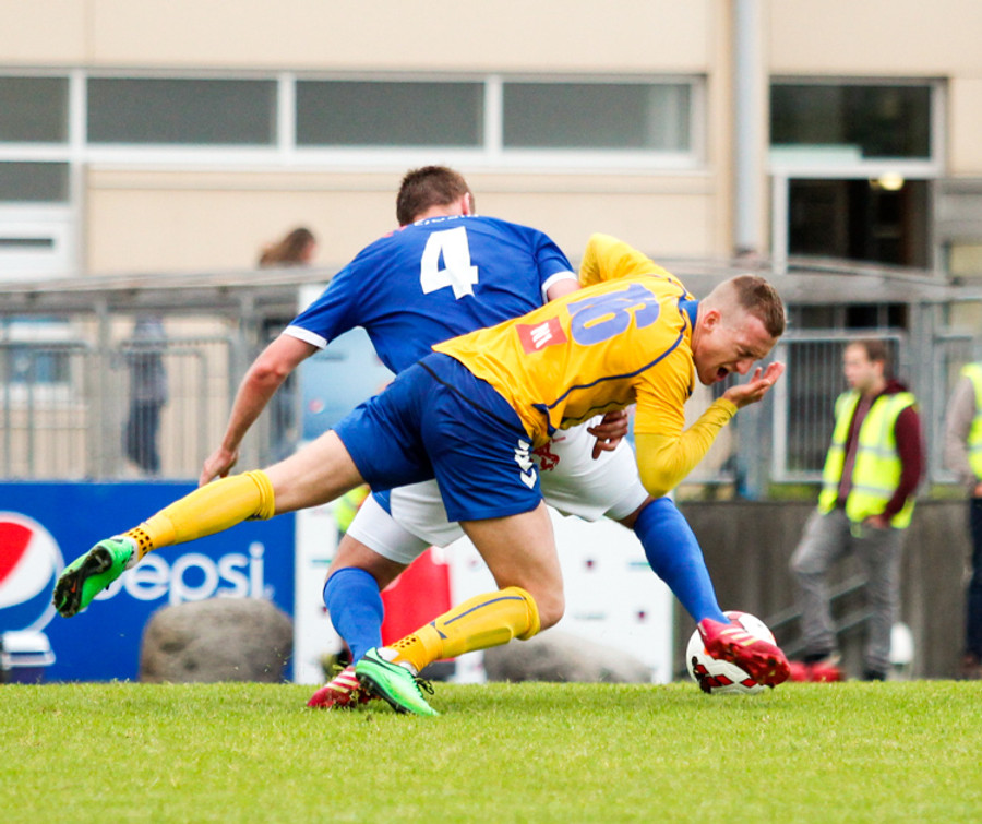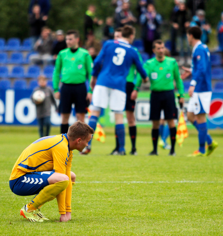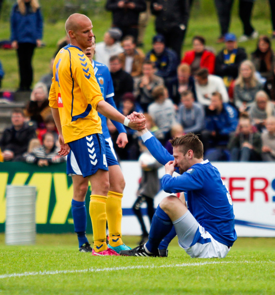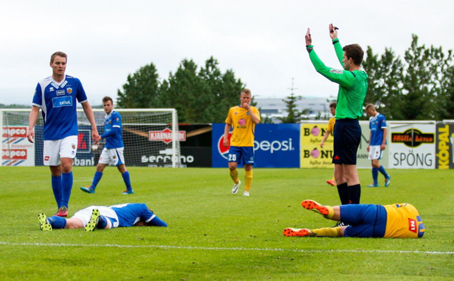 Ögmundur og Guðmundur Karl fara saman upp og skella saman. Hrynja báðir í jörðina og eru aumir. Standa samt báðir upp og halda leik áfram.