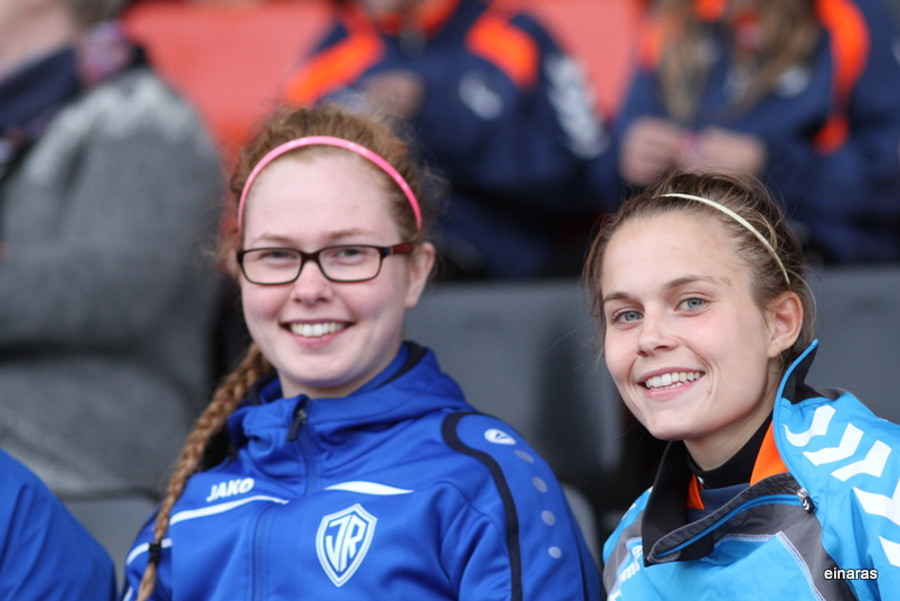 Guðmunda Brynja liggur í jörðinni eftir samstuð við Hawkins. Sýnist eitthvað vera að henni í hnéinu.