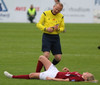 Hrafnhildur Hauksdóttir liggur eftir á vellinum og þarf að fara útaf í börum. Ekki veit ég hvað gerðist.
