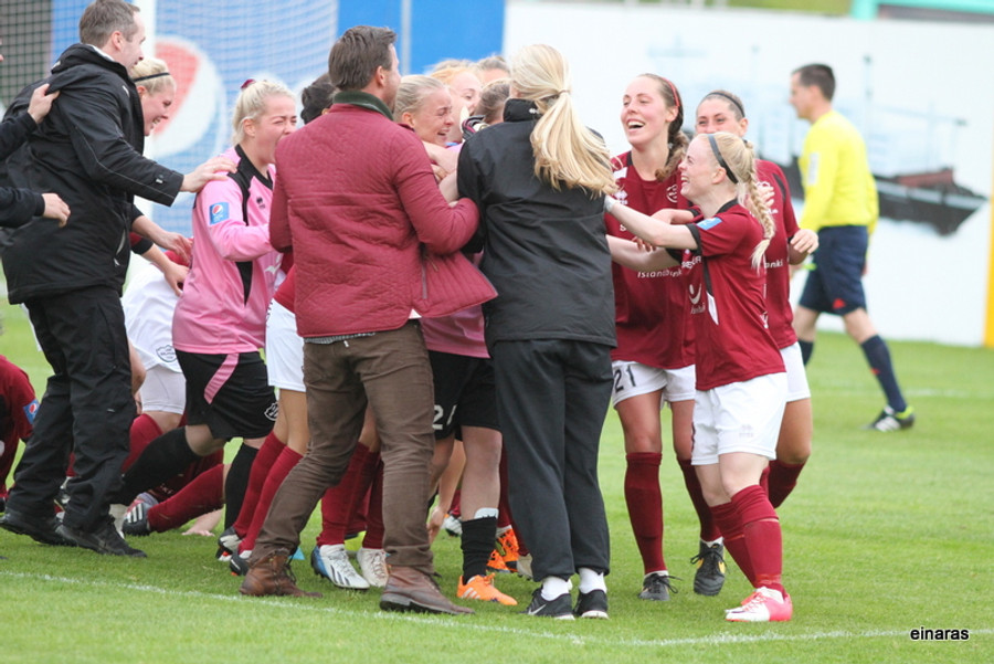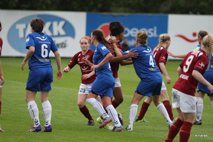 Aukaspyrna og hér fær Hrafnildur Hekla dauðafæri. Hefði hún sett höfuðið í boltann hefði hann farið inn. Þetta var rosalegt.