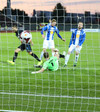 ROLF TOFT!!!! Eftir hornspyrnuna datt boltinn fyrir Rolf í teignum en skot hans fór í hliðarnetið.