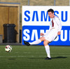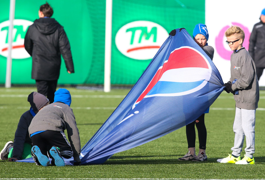 Það er mikill vindur á vellinum! Það sást vel þegar Þorri Geir átti skot fyrir utan teig eftir aukaspyrnu, hitti boltann illa og hann fór beint upp í loftið en vindurinn hélt honum inni á vellinum.