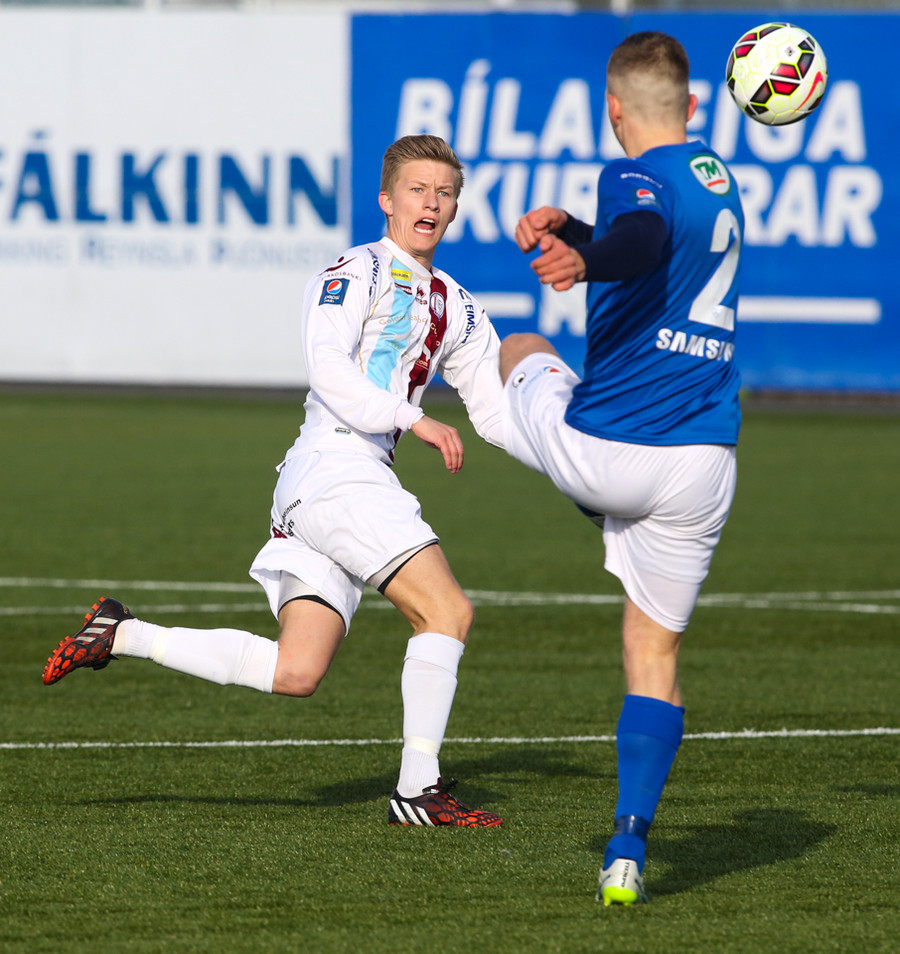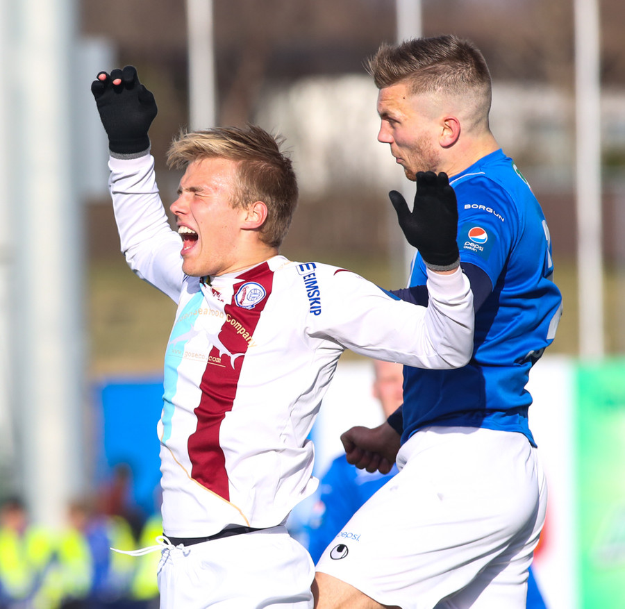 MAAAARK!!! Heiðar Ægisson fór afar illa með Charley Fomen, bakvörð Leiknis, skildi hann eftir í rykinu og gaf fyrir þar sem hinn afar seigi Jeppe Hansen skallaði knöttinn inn!