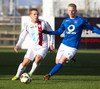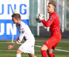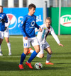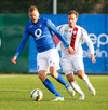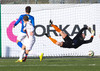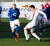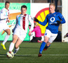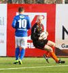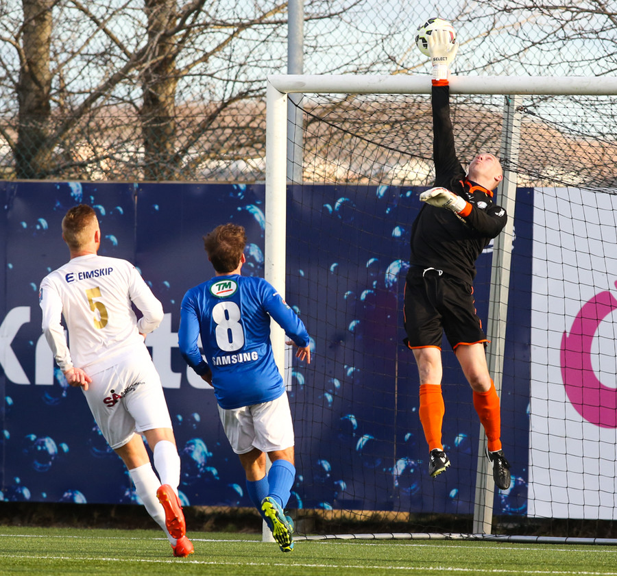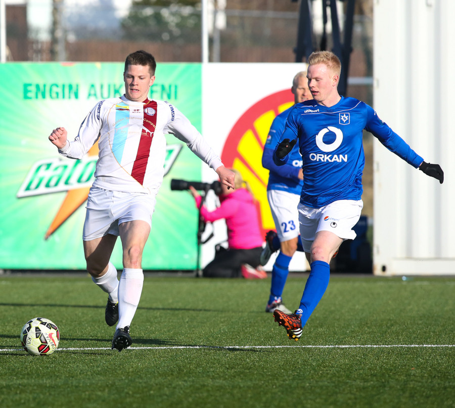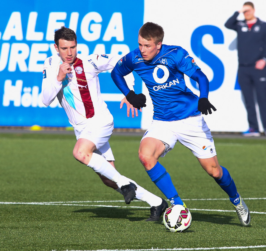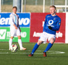 Ólafur Karl Finsen sýnir hraða og leikni, náði skoti á markið en Eyjólfur Tómasson varði vel.