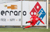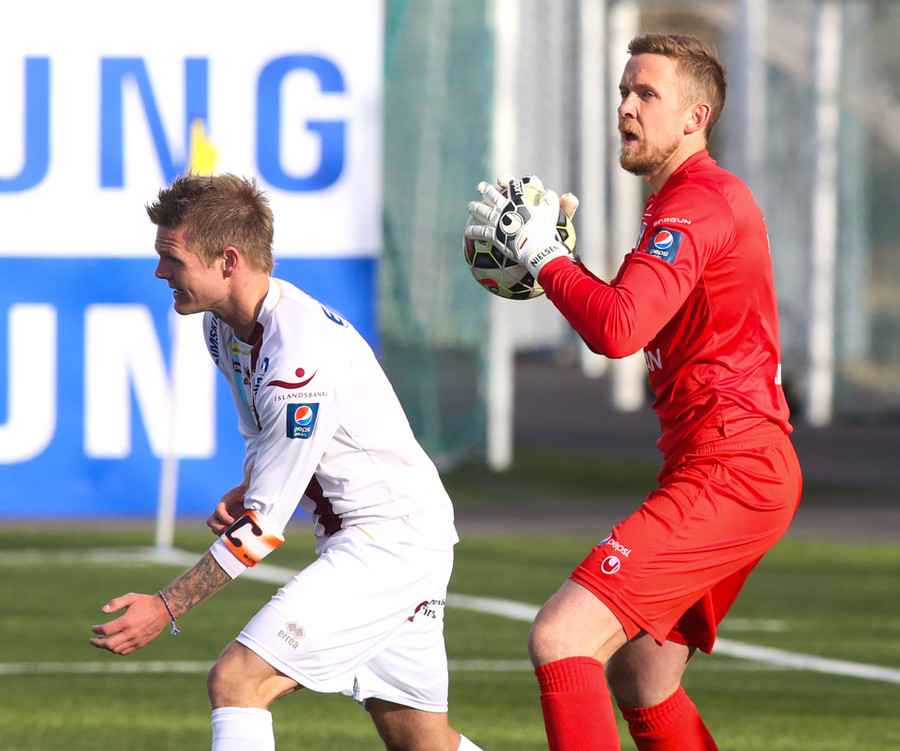 Leiknismenn með aukaspyrnu sem Gunnar Nielsen kýlir frá. Sá færeyski ætlar ekki að fá mark á sig í sumar!