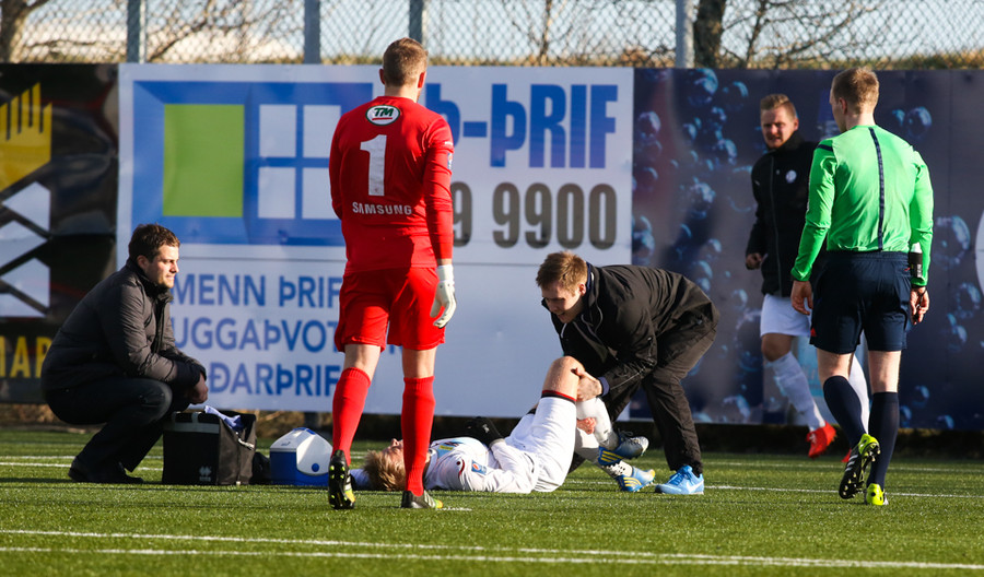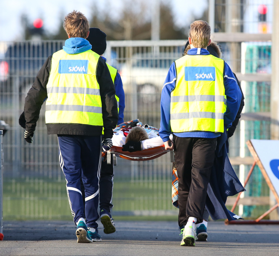 Óttar Bjarni settur á börur og þarf að yfirgefa völlinn eftir samstuð. Áfall fyrir Leikni enda Óttar algjör lykilmaður.
