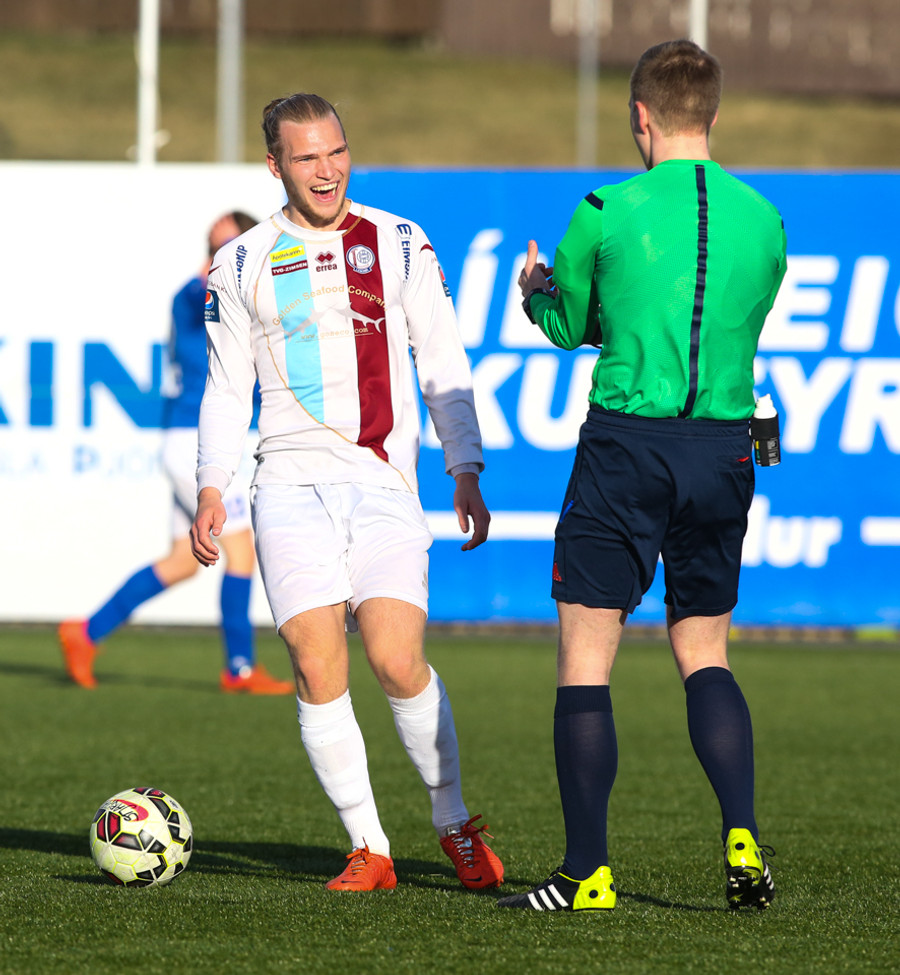 Þorri Geir fær gula spjaldið. Aðstoðardómarinn lét spjalda Þorra eftir að hann braut á Atla.
