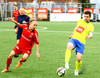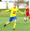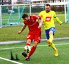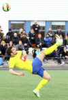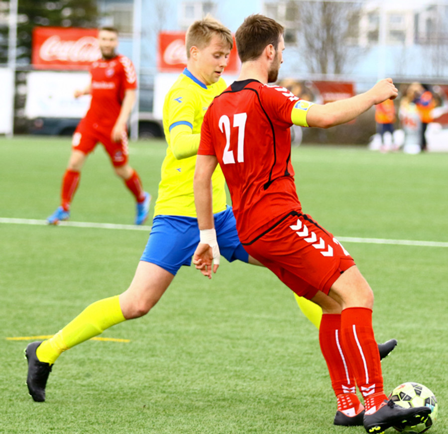 Ævar Ingi klobbar hér annan hvern mann við mikinn fögnuð áhorfanda vallarins en boltinn í horn!