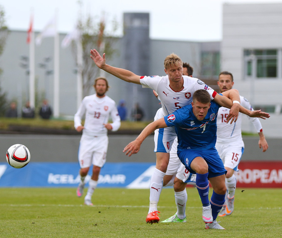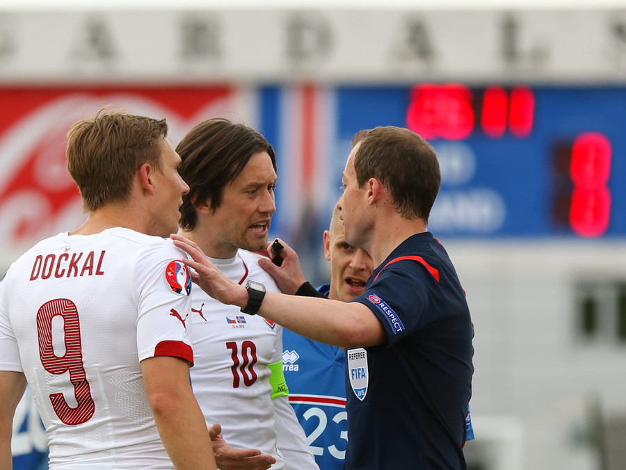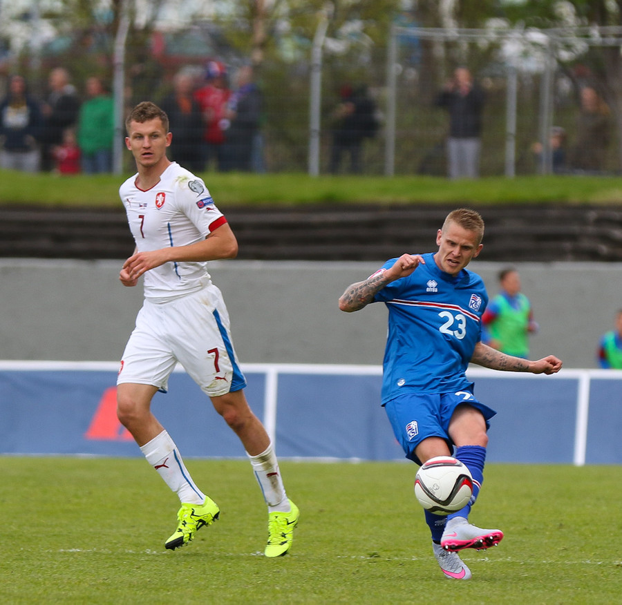 — Chris Boothroyd (@czefootball) June 12, 2015Hann er kominn með tvö spjöld, fái hann spjald í kvöld, verður hann í leikbanni í næsta leik gegn Hollandi.