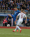 Íslendingar stilla upp og Ari Freyr tekur spyrnuna.