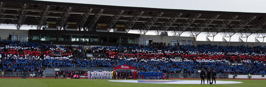 Stúkan er að fyllast og tekur vel undir, bæði í þjóðsöngnum og klappar vel fyrir því þegar Röddin kynnir byrjunarlið Íslands!