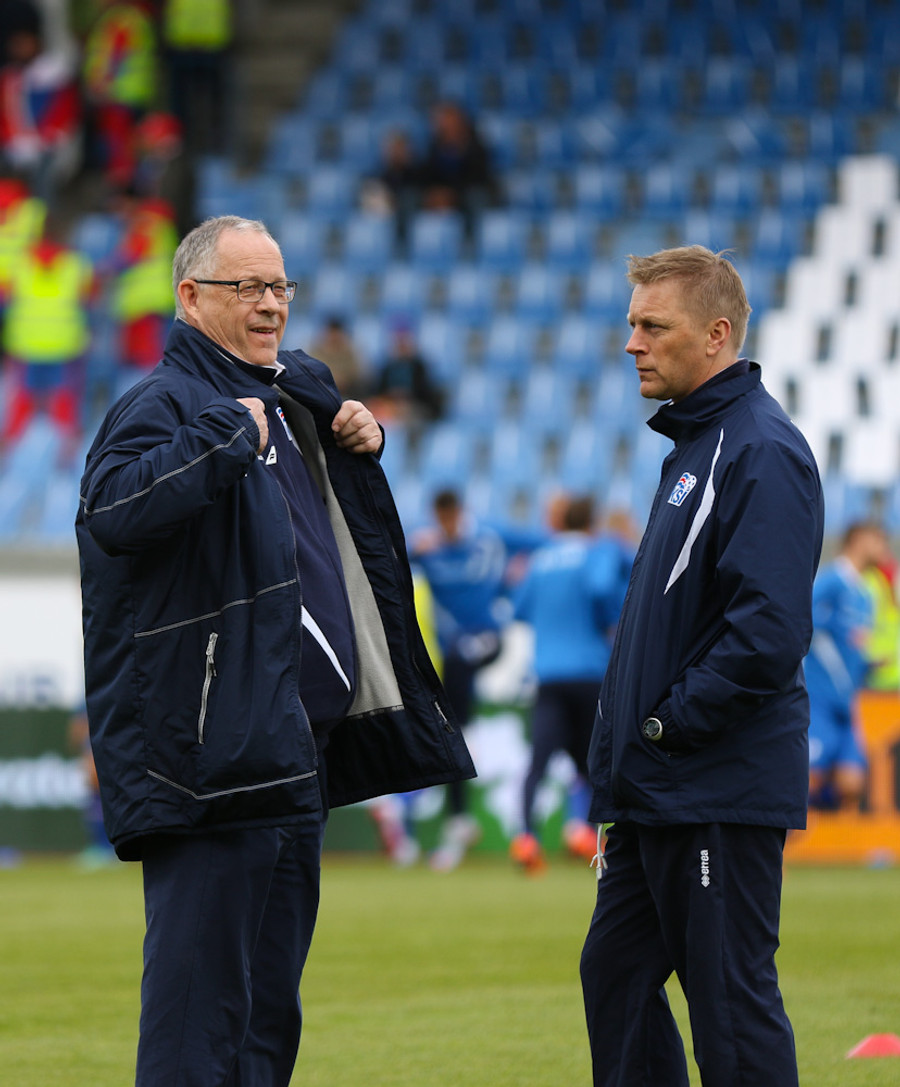 Miðverðirnir Kári Árnason og Ragnar Sig. hafa verið traustir varnarlega en hafa átt í erfiðleikum með að koma boltanum frá sér á sóknarmenn Íslands. Löngu og háu spyrnur þeirra, hafa lítið skilað.