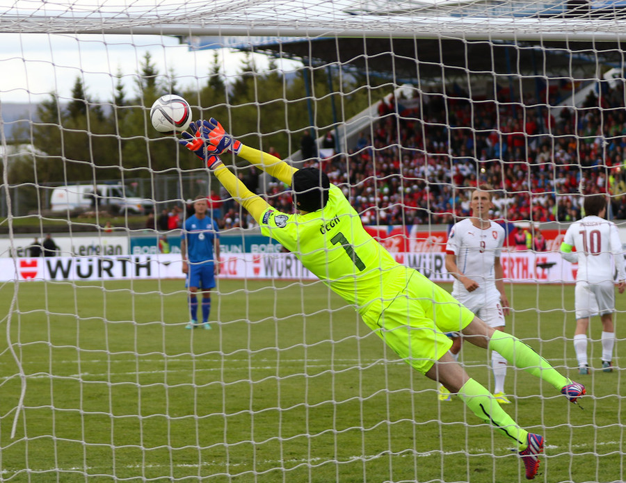 Petr Cech grípur boltann frá Gylfa úr horninu, alltof auðveldlega.