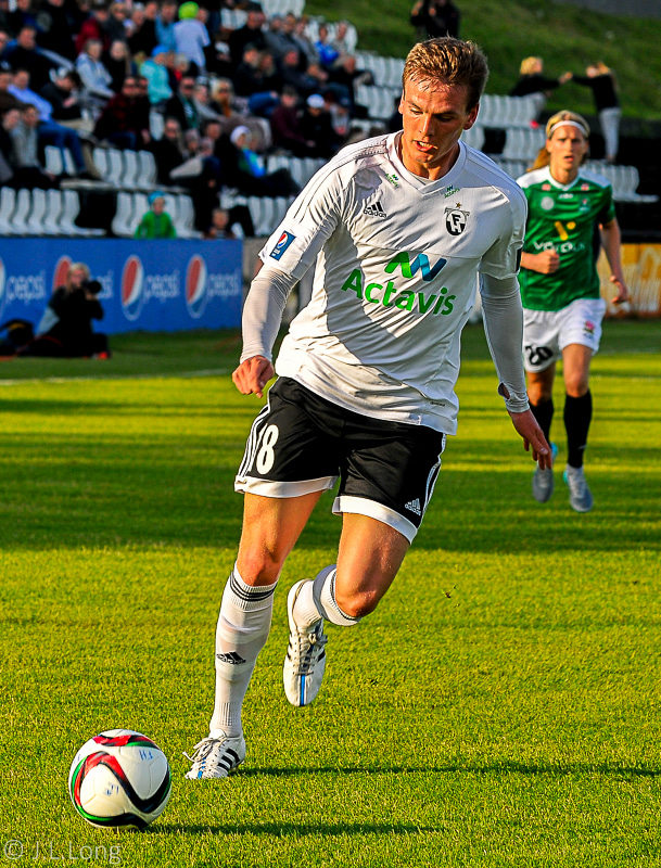 Þórarinn Ingi fer upp vinstri kantinn og inn á miðjuna en er þar jarðaður af Elfari Frey. FH-ingar í stúkunni orðnir vel pirraðir og hrista hausinn yfir þessu hjá Þórarni. Þarna reyndi hann of mikið.