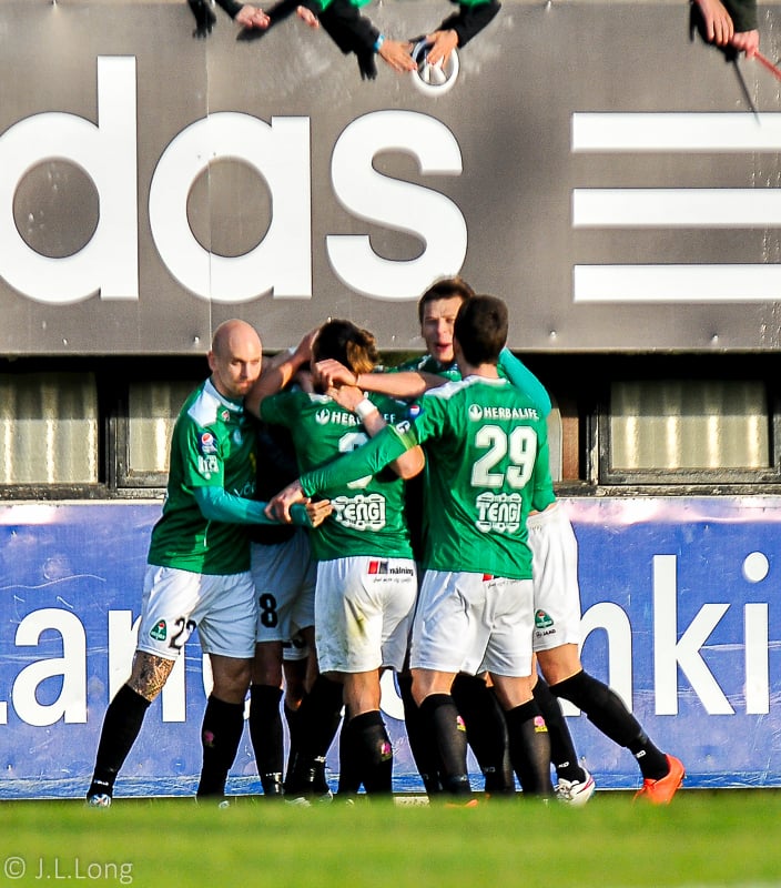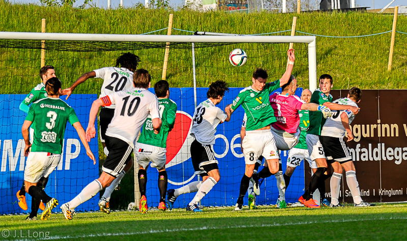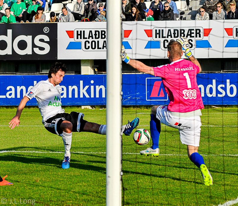 Gunnleifur var í boltanum en sló boltann í þverslánna og inn.