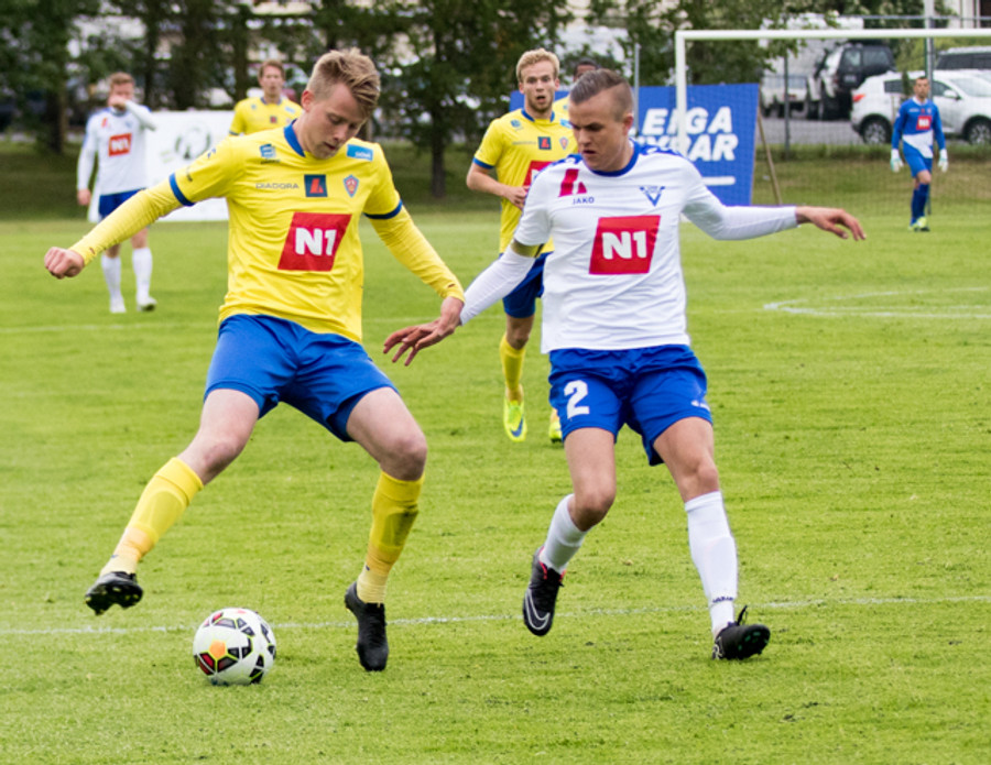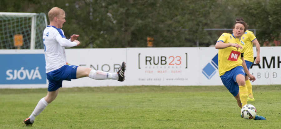 Elfar með fína rispu upp kantinn, boltinn berst á Jóhann Helgason sem skýtur boltanum framhjá