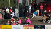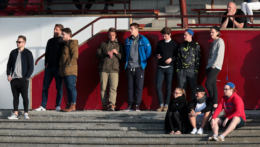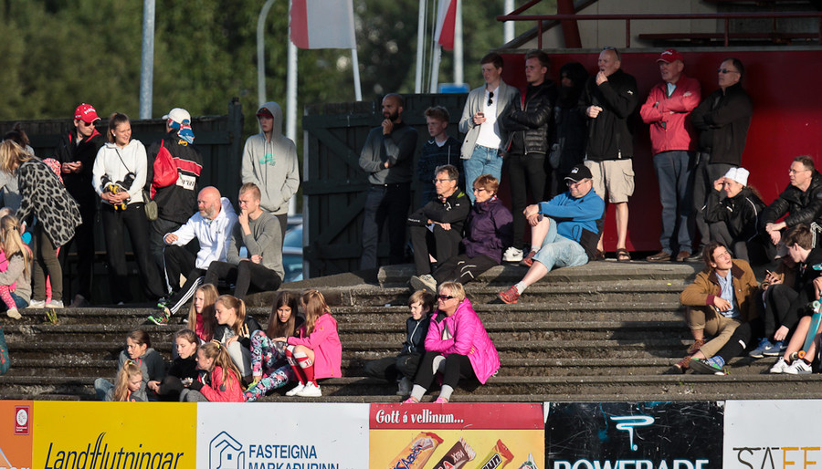 Hvet fótboltaáhugafólk til að skella sér á völlinn. Sólin skín og það er algjört logn. FLestir áhorfendur sem mættir eru hafa komið sér fyrir til hliðar við stúkuna enda er stúkan í skugga.