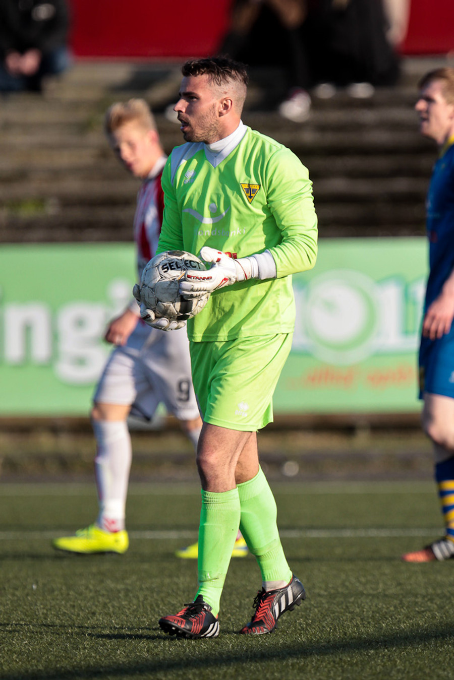 ÞRÓTTUR KEMST YFIR!!! Rafn Andri Haraldsson með skalla sem Árni Freyr náði ekki að verja. Frábær fyrirgjöf frá hægri.