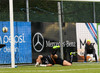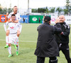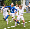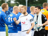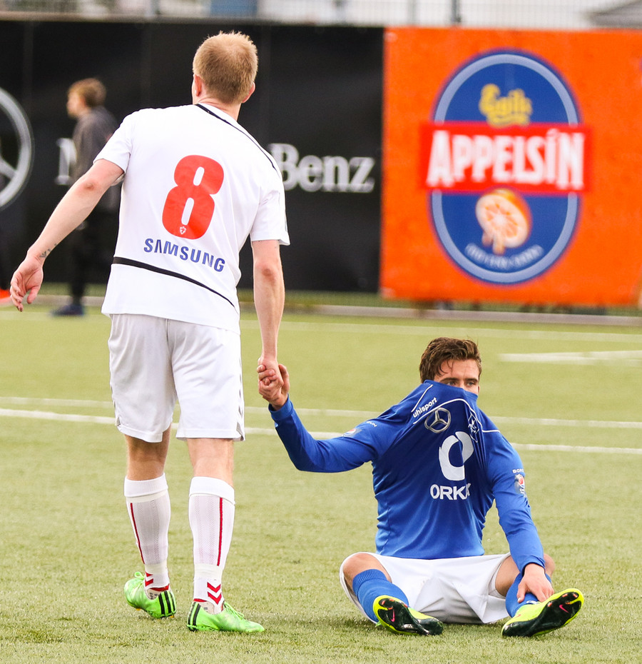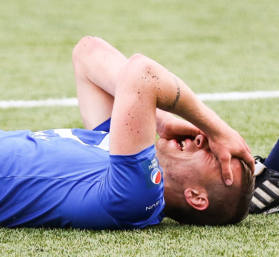 Haukur Páll og Óli Kalli lentu í samstuði og liggur Haukur Páll eftir og heldur um magann á sér.