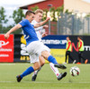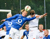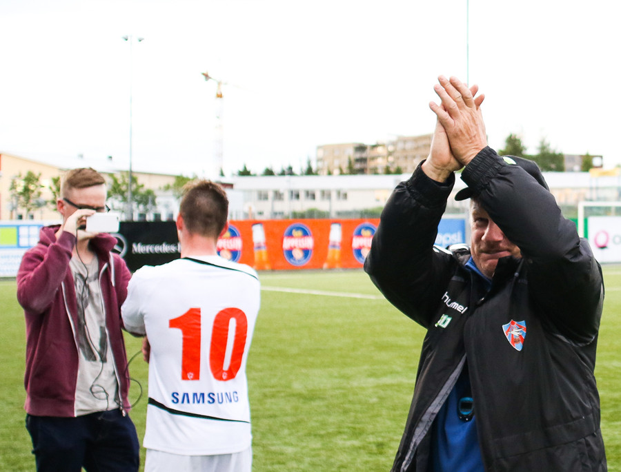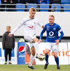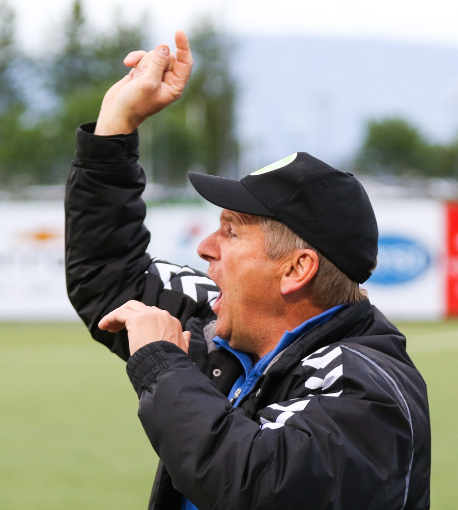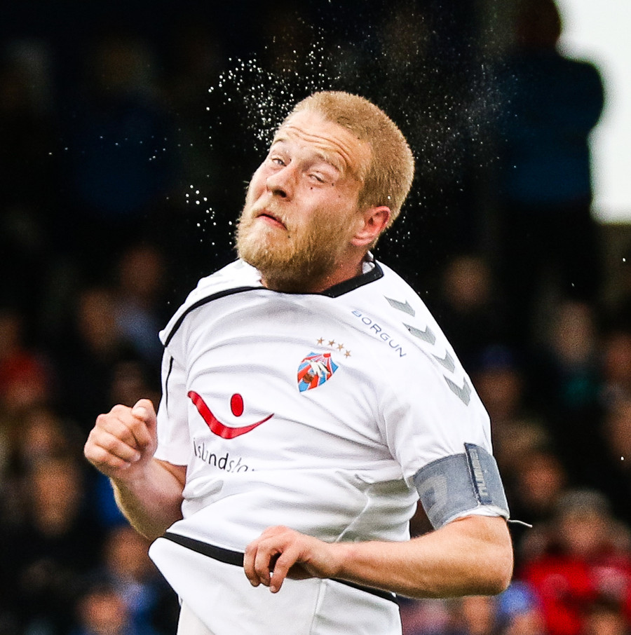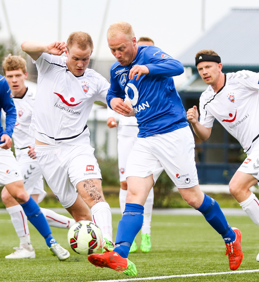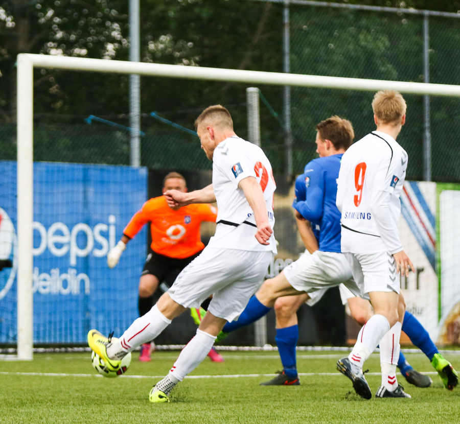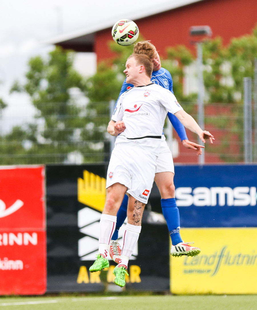 Jón Arnar Barðdal kastaði sér fram í skalla en boltinn fór framhjá markinu. Hefði verið drauma innkoma!