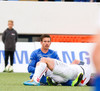 Kristinn Freyr lá eftir á vellinum, í vítateig sinna manna og fór svo út að hliðarlínu til að fá aðhlynningu. En virðist vera á leið aftur inná.