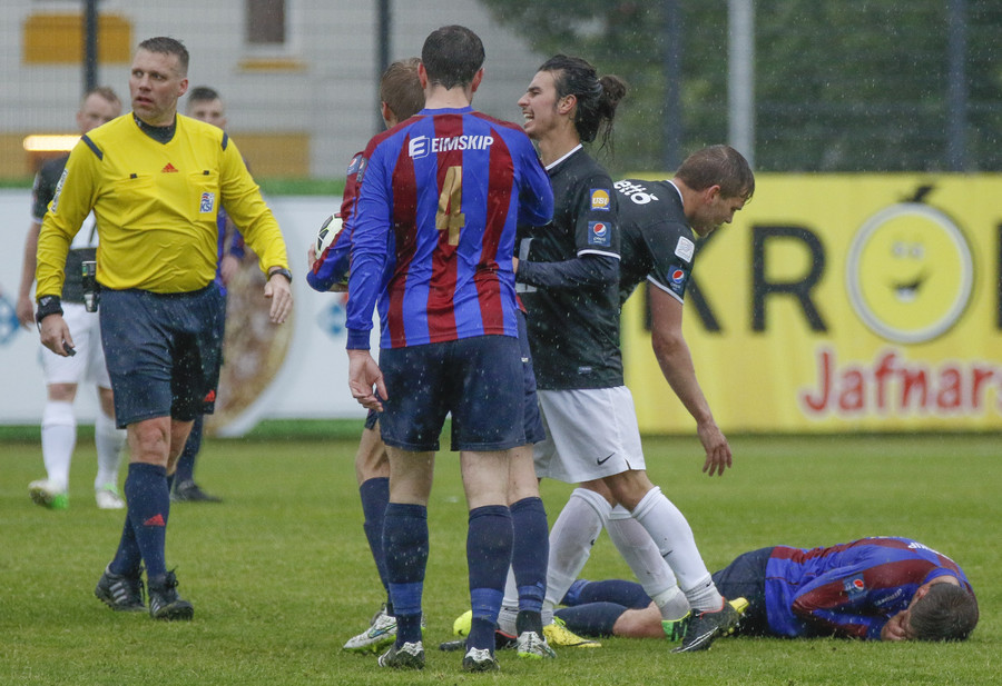Sindri Kristinn er staðinn á fætur og leikurinn er hafinn á ný eftir þessa stuttu töf.