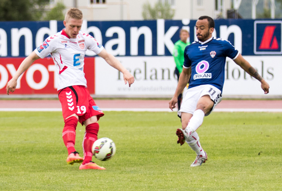 Dion Acoff fær hér aukaspyrnu á fínum stað fyrir Þrótt.
