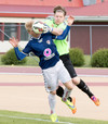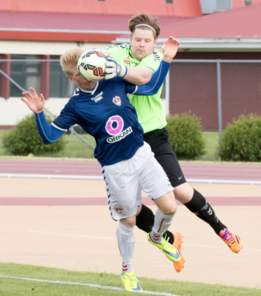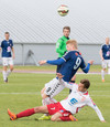 Jóhann Helgi fær skalla uppúr aukaspyrnunni en Trausti grípur boltann auðveldlega