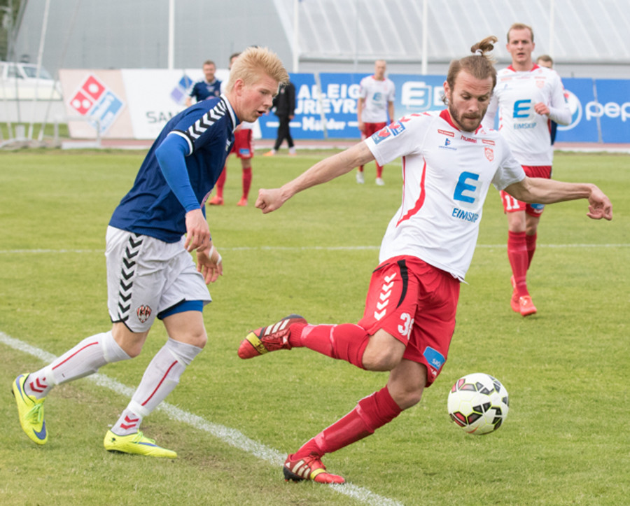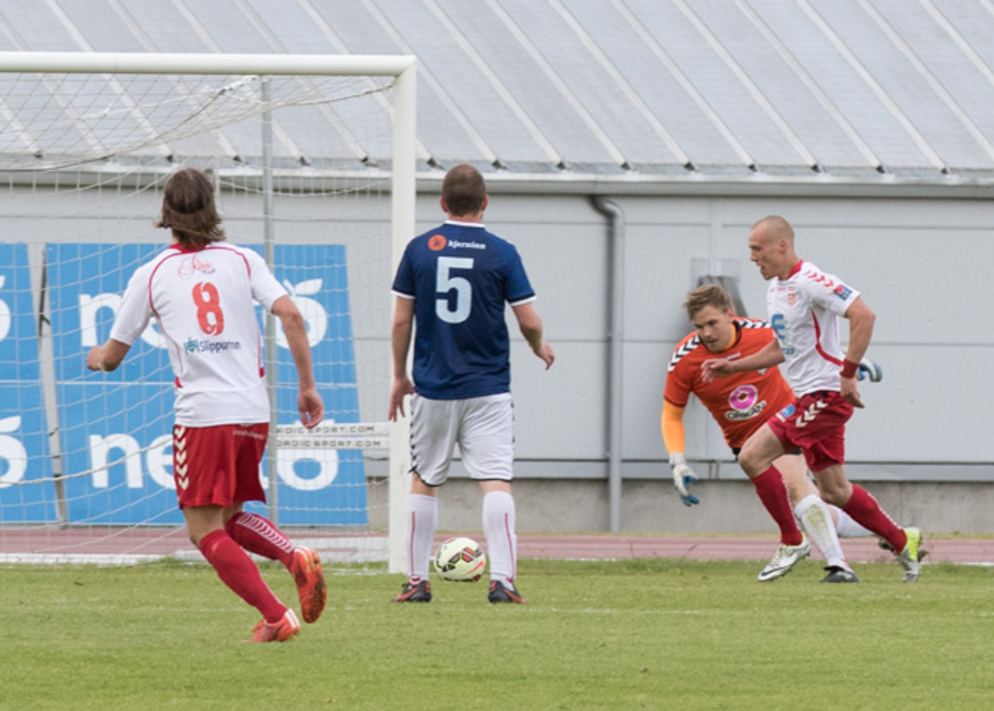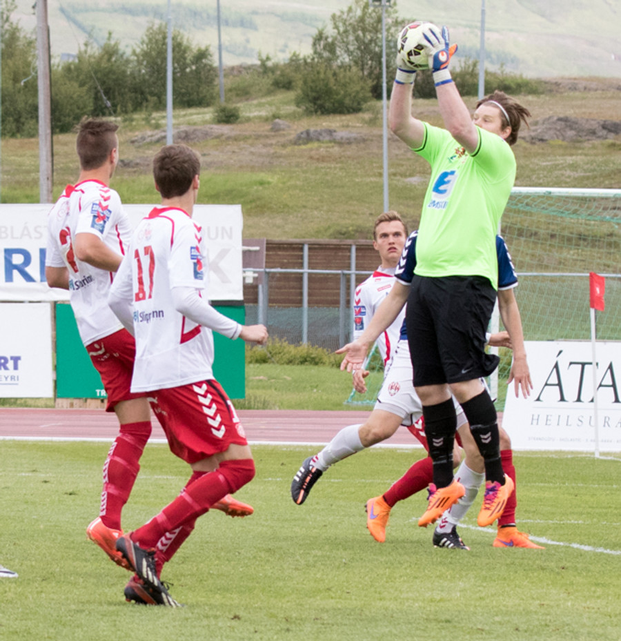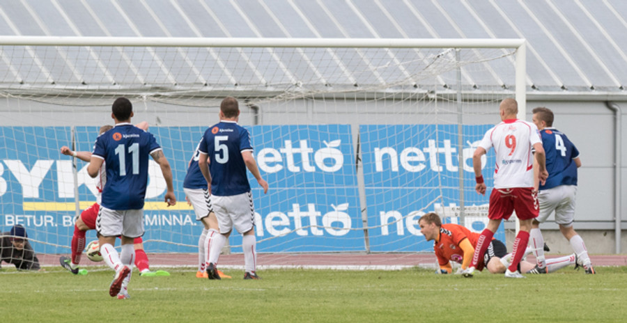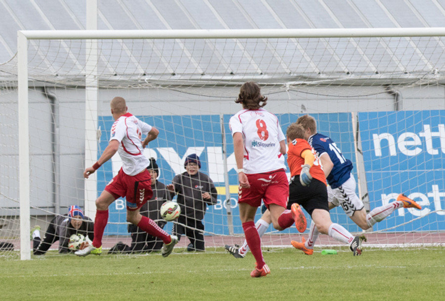 Þarna munaði litllu að Þórður Steinar næði til boltans eftir aukaspyrnu. Hefði pottþétt verið mark ef hann hefði náð tánni í hann