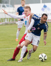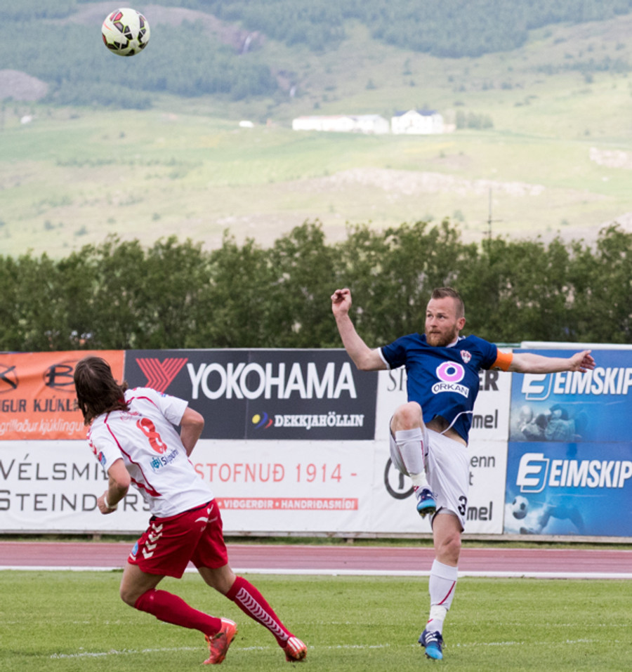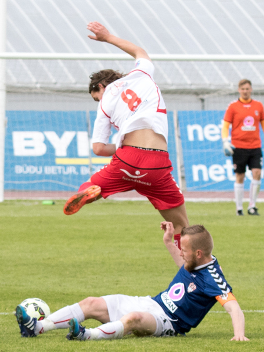 DAUÐAFÆRI. Jóhann Helgi gerir vel í að senda Svein Elías í gegn en Trausti ver skot hans. Þarna átti fyrirliðinn að gera betur