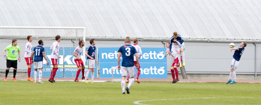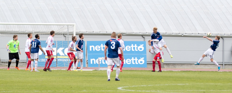 Jóhann Helgi nær að komast á endan á aukaspyrnu frá Jónasi en boltinn rétt framhjá markinu
