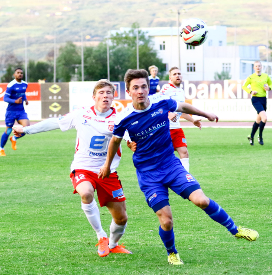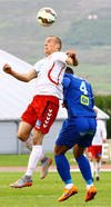 Jóhann Helgi dúndrar boltanum yfir með höfðinu eftir horn. Þessi braut glugga í Grímsey!