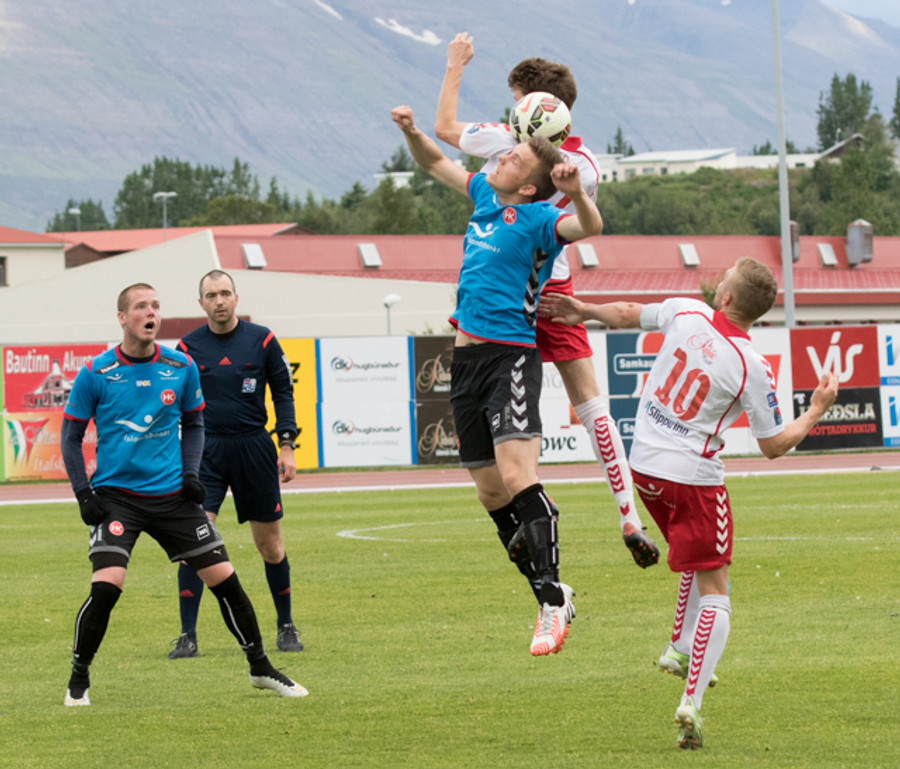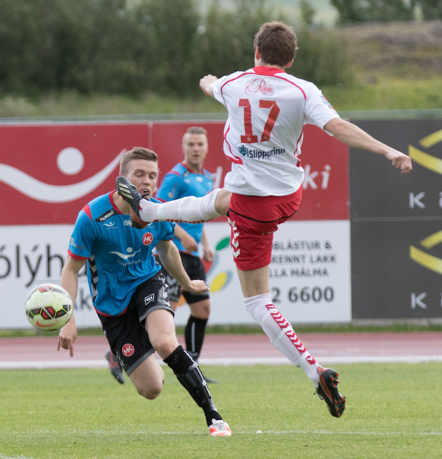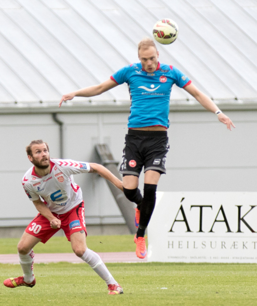 Þarna hefðu heimamenn getað fengið víti. Kiddi Björns setur boltann beint í hendina á leikmanni HK en ekkert dæmt