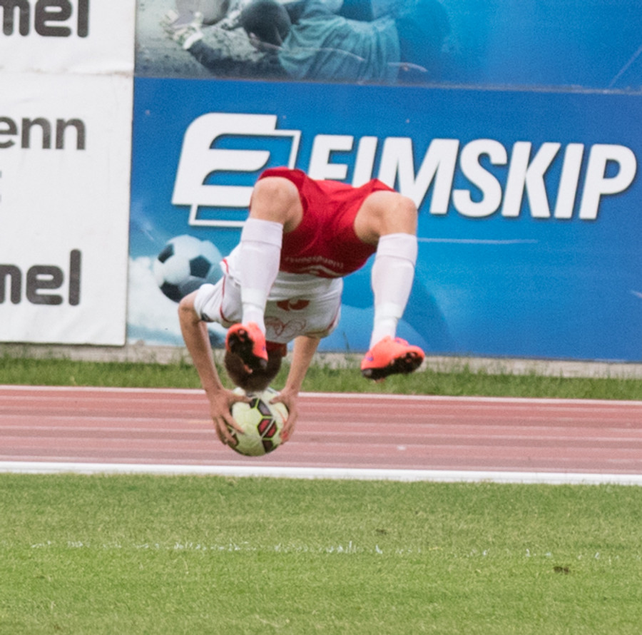 Jónas tekur Hjólhestaspyrnu sem Beitir ver í horn. Skemmtileg tilraun.