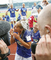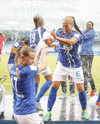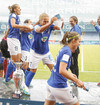 Hörkufæri!! Donna Kay Henry kemst ein í gegn en ákveður að skalla boltann áfram fyrir sig í stað þess að láta hann detta og taka skotið! Snertingin of föst og Sandra grípur boltann.