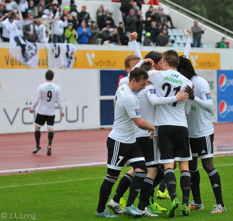 Atli Guðna var við að sleppa í gegn, Elfar hreinsar á Þórarinn sem sendir beint á Atla sem enginn er að passa, hann fær nægan tíma og neglir í stöngina inn á fjær.