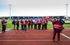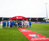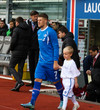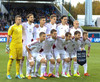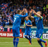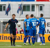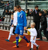 Nú koma svo leikmennirnir inná völlin. Ísland er auðvitað í bláu á meðan gestirnir eru í varabúningum sínum, sem er hvítir frá toppi til táar.